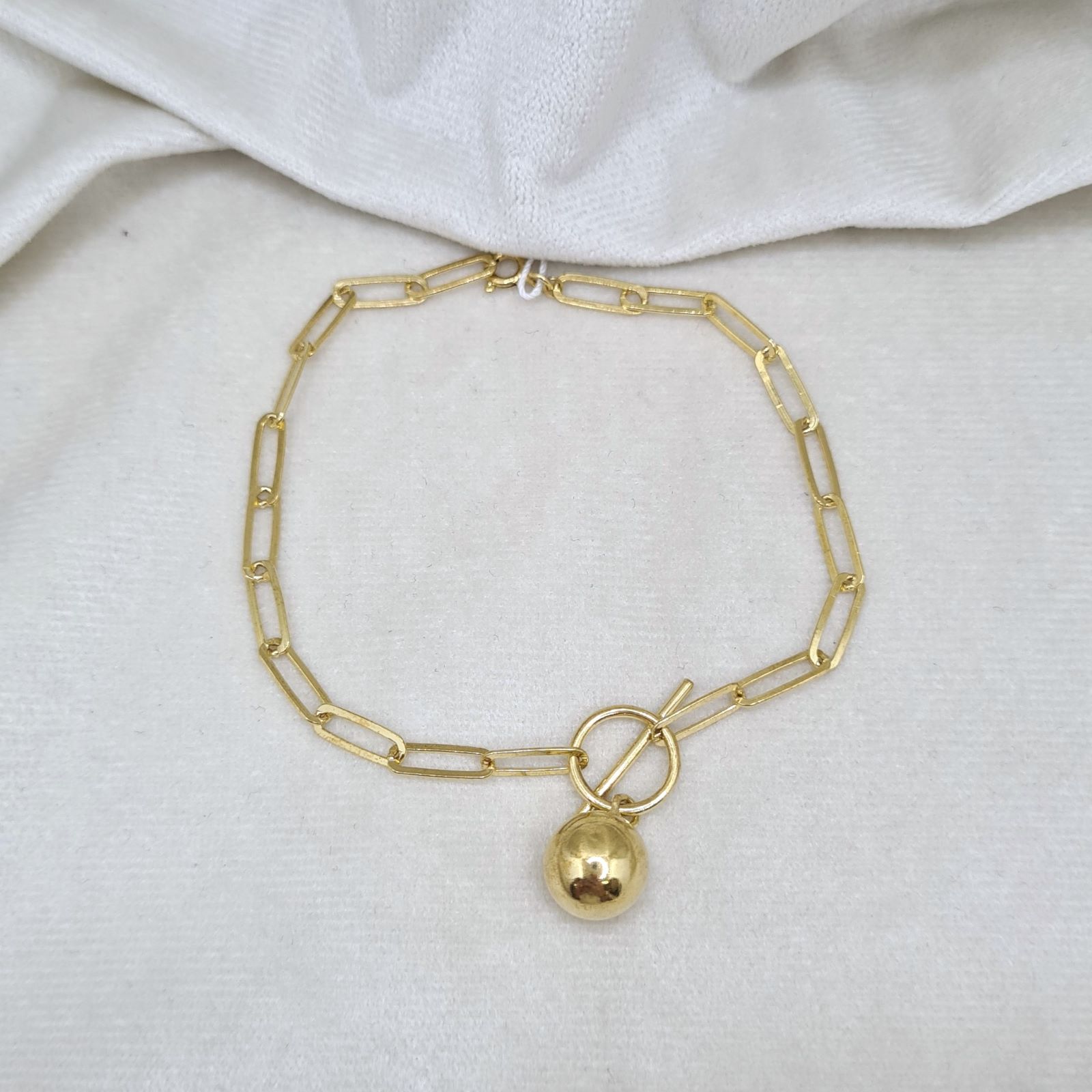 Srebrna bransoletka pozłacana z ozdobną kulką. Bransoletka posiada klasyczne zapięcie, element przy kulce stanowi ozdobę. Do kompletu można dokupić naszyjnik.