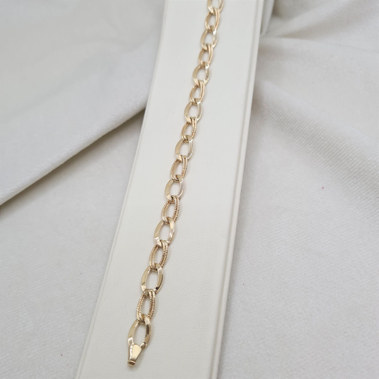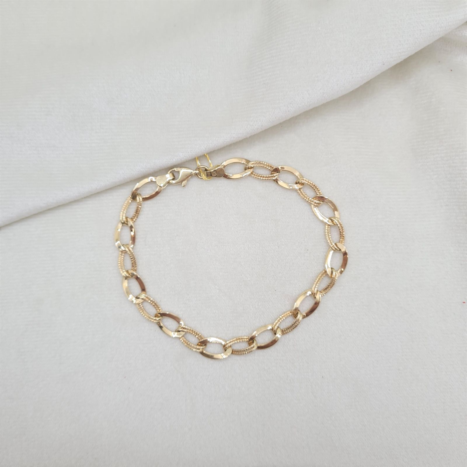 Złota bransoletka złożona z dużych owalnych ogniw, wykonana ze złota próby 585. Zapięcie – karabińczyk. Pięknie prezentuje się na damskiej dłoni.
