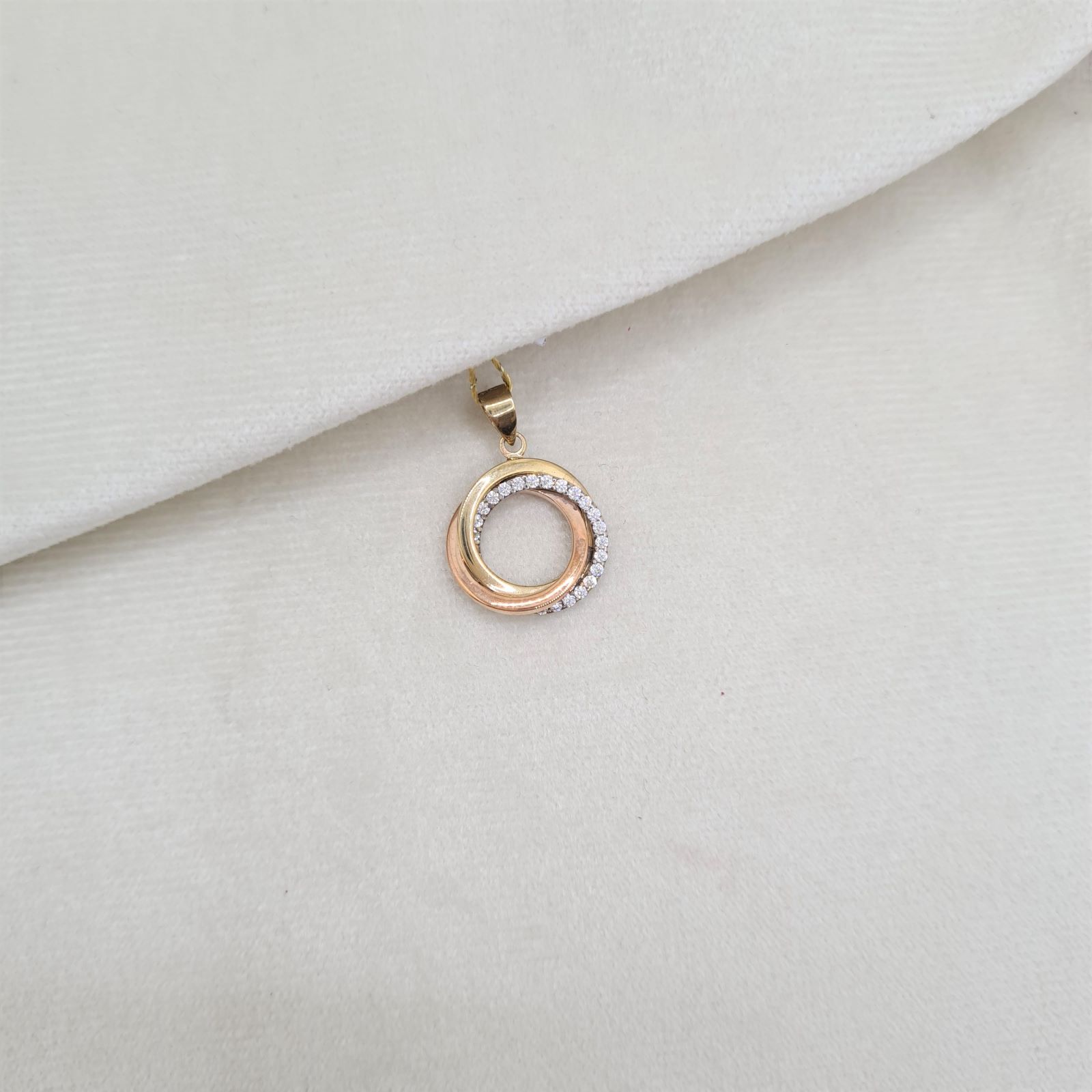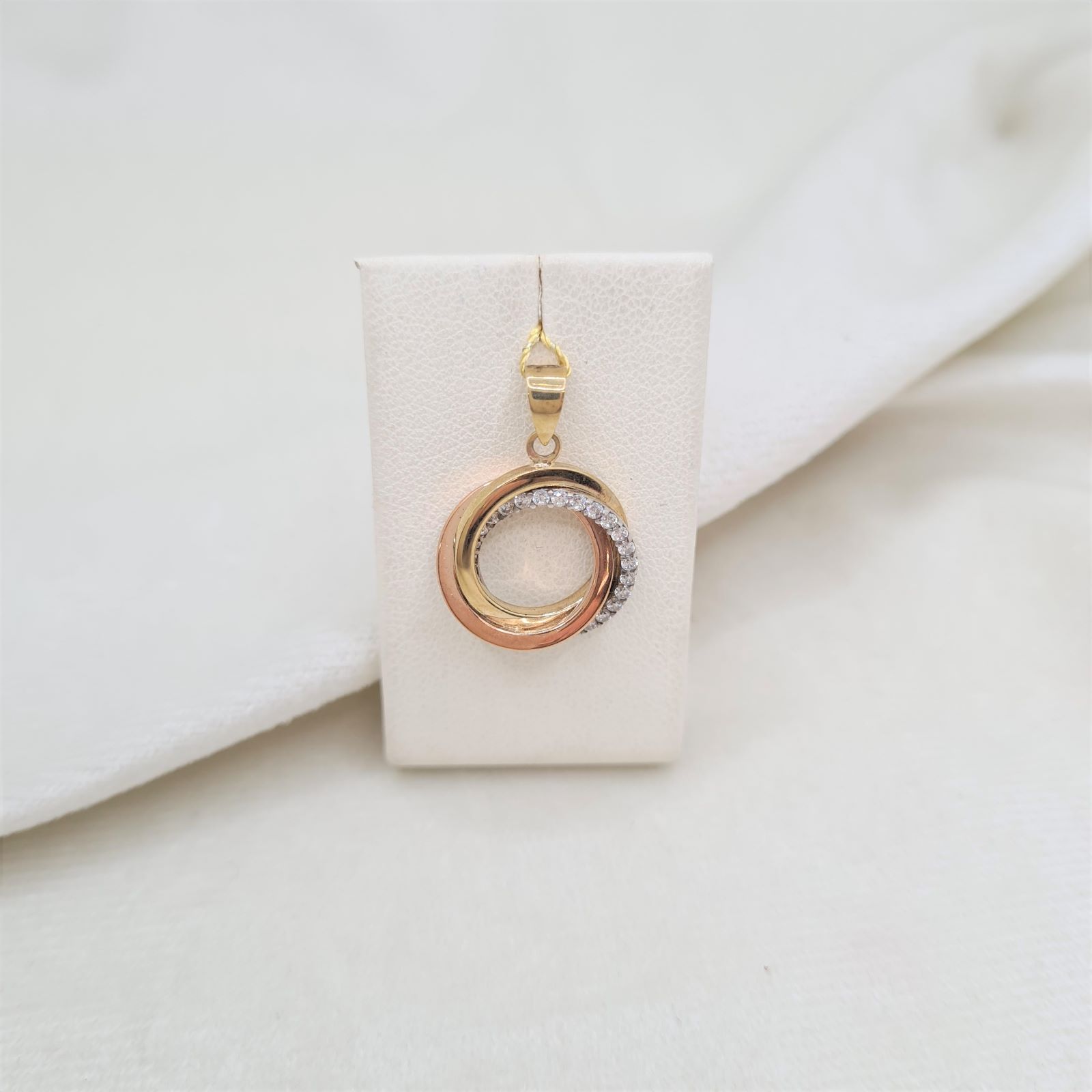 Złota zawieszka dla kobiet, wykonana ze złota próby 333. Okrągła zawieszka złożona z trzech przeplatanych kółeczek, jedno wykonane z żółtego złota, drugie z różowego złota i jedno z białego z cyrkoniami. Zawieszona na łańcuszku doskonale prezentuje się w dekolcie.