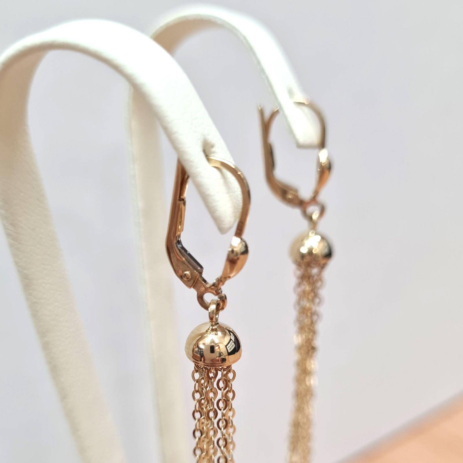 Złote kolczyki długie wiszące chwosty z kilku łańcuszków. Wykonane z żółtego złota próby 585. Zapinane na bigiel francuski. Wzór wiszących łańcuszków w kolczykach to ankier. Kolczyki doskonale nadają się zarówno do wieczorowych kreacji jak i do codziennych stylizacji.