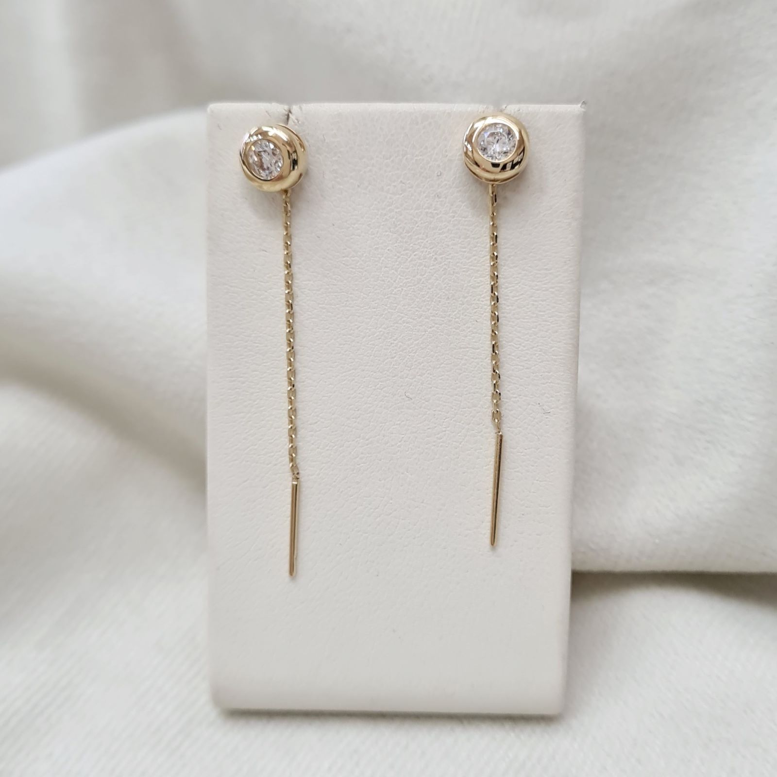 Złote kolczyki długie wiszące przewlekane łańcuszki z cyrkonią. Wykonane z żółtego złota próby 585. Idealnie pasują zarówno na co dzień jak i na wieczorowe wyjścia.