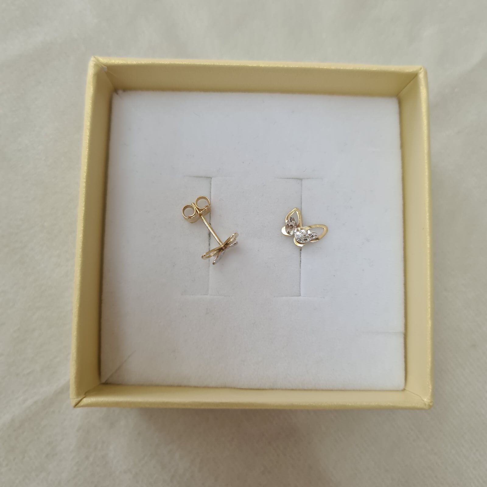Złote kolczyki zapinane na wkręty. Piękny wzór w kształcie motylków, dzięki diamentowaniu pięknie błyszczą. Wykonane z żółtego złota próby 585, rodowane. Kolczyki doskonale nadają się dla małej dziewczynki.